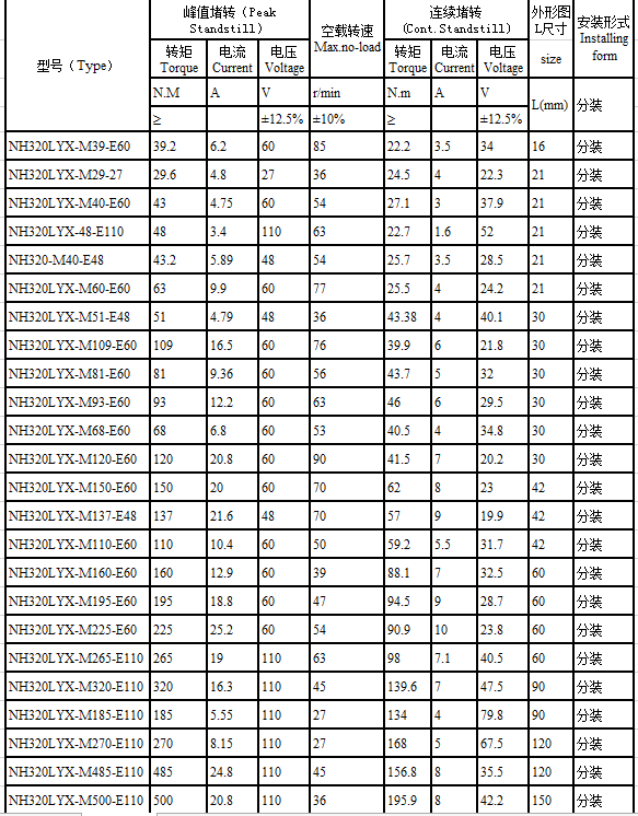 NH320LYX series brushless torque motor performance indicators